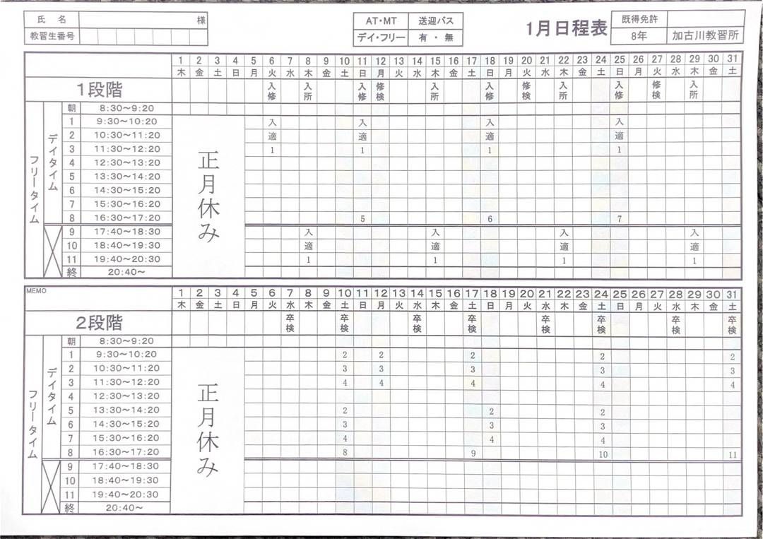 スケジュール・安心スケジュールコースの方で、日程表は受付カウンターにもございますので、卒業までの予約がまだの方は、お早めに提出してください。