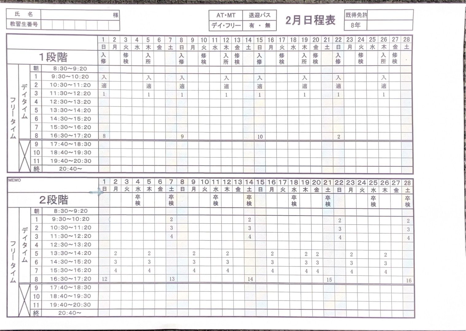 スケジュール・安心スケジュールコースの方で、日程表は受付カウンターにもございますので、卒業までの予約がまだの方は、お早めに提出してください。